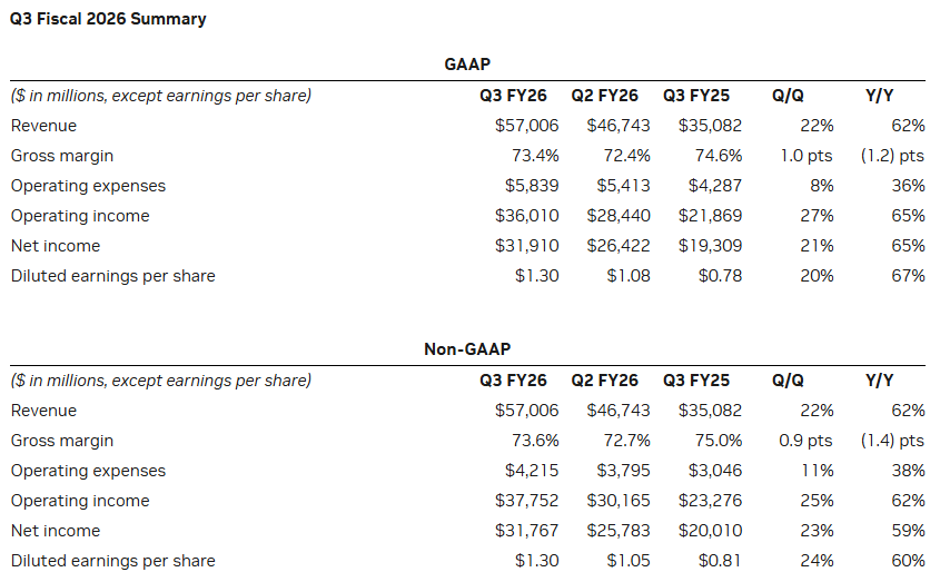 - Total revenue: $57.0 billion (up 62% year-over-year, up 22% quarter-over-quarter)